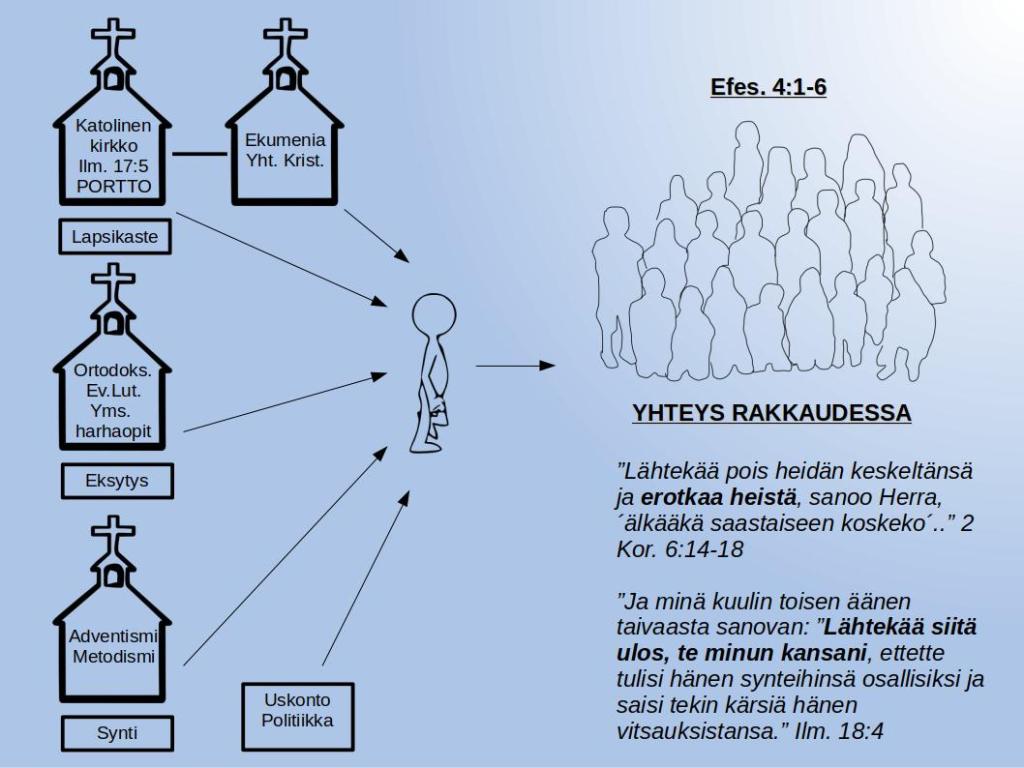 Raamattu opettaa näin: ”Kukistunut, kukistunut on suuri Babylon! Siitä on tullut riivaajien asuinpaikka ja kaikkien saastaisten henkien tyyssija, kaikkien saastaisten lintujen ja kaikkien saastaisten ja vihattavien petojen pesäpaikka. Sillä hänen haureutensa vihan viiniä ovat kaikki kansat juoneet, maan kuninkaat ovat harjoittaneet haureutta hänen kanssaan, ja maan kauppiaat ovat rikastuneet hänen ylellisyytensä runsaudesta.” Sitten kuulin toisen äänen taivaasta sanovan: ”Lähtekää sieltä ulos, minun kansani, ettette tulisi osallisiksi hänen synteihinsä ja saisi osaksenne hänen vitsauksiaan, sillä hänen syntinsä ovat ulottuneet taivaaseen asti, ja Jumala on muistanut hänen rikoksensa.” Ilm. 18:2-5.